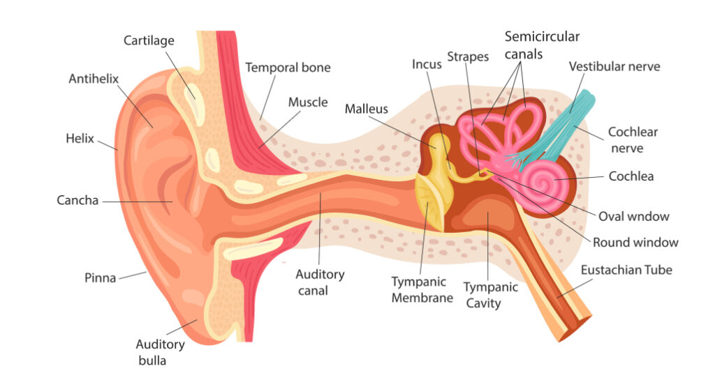 La parte visibile dell’orecchio, detta padiglione auricolare, funge da “antenna” che raccoglie e convoglia i suoni all’interno del condotto uditivo. Al termine del condotto si trova il timpano, una sottile membrana che inizia a vibrare al passaggio delle onde sonore.
